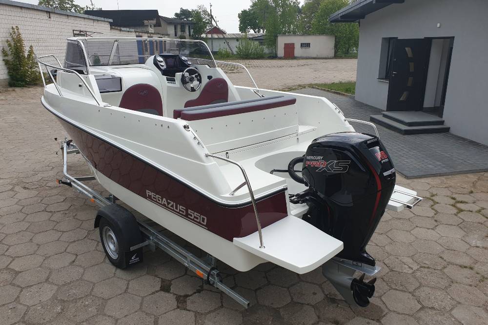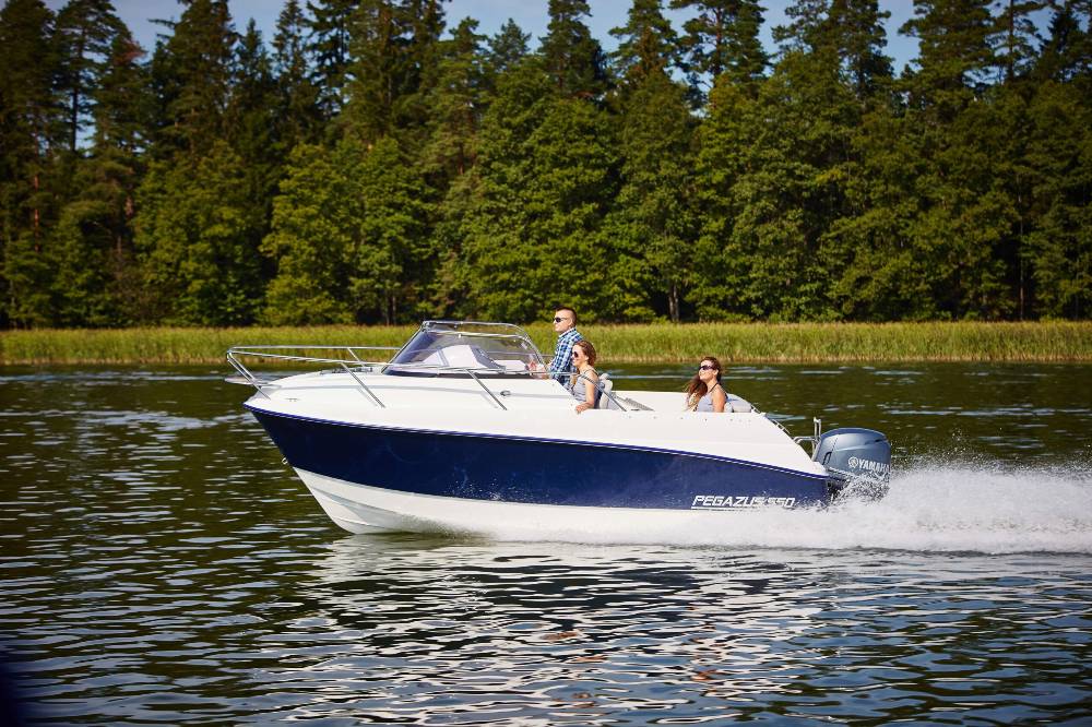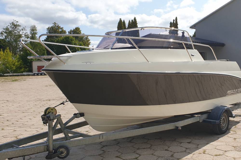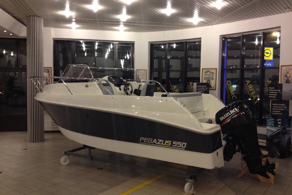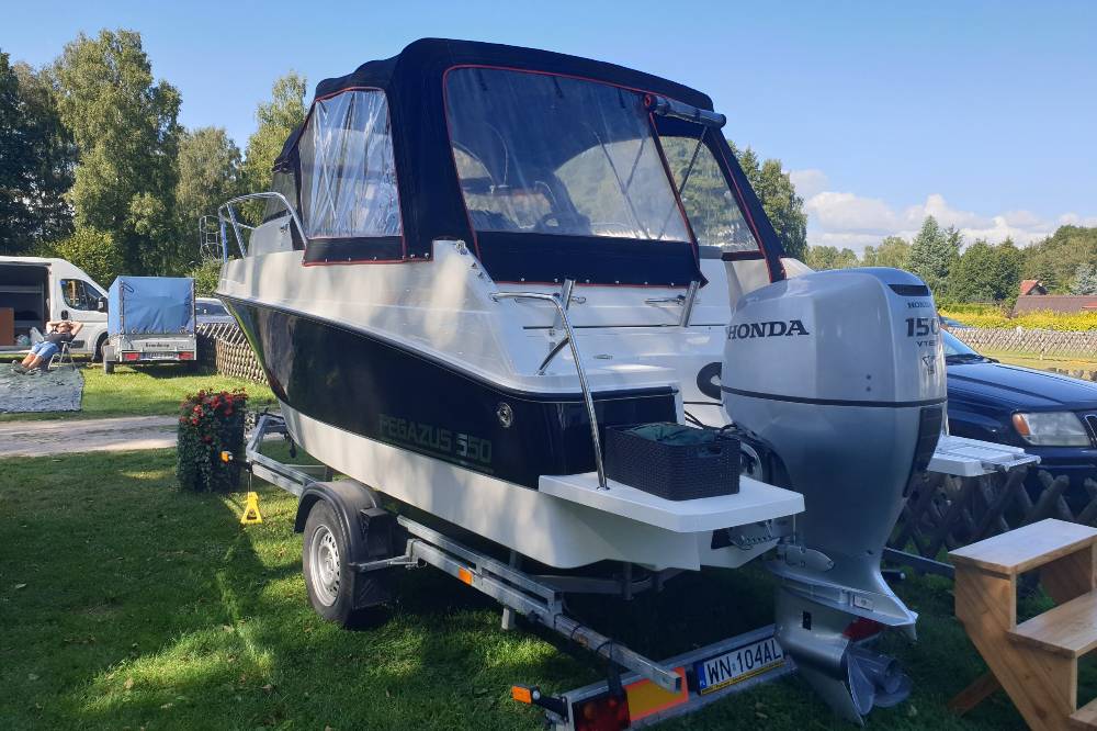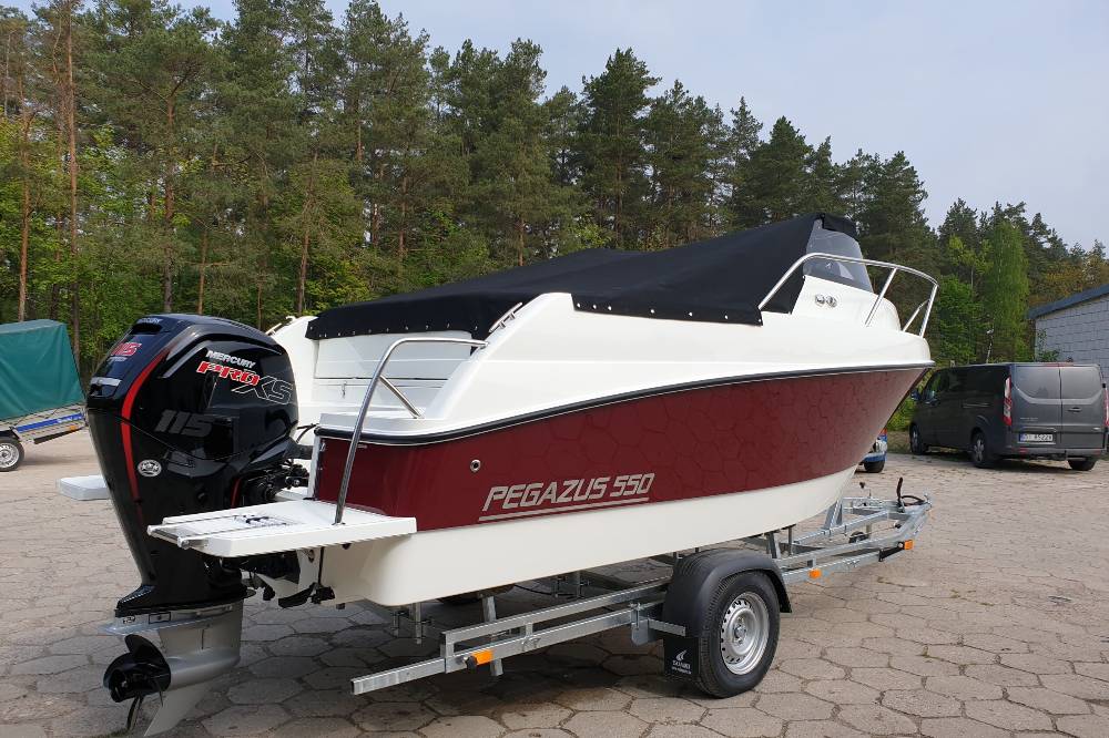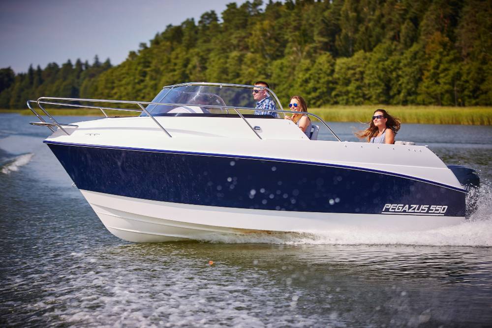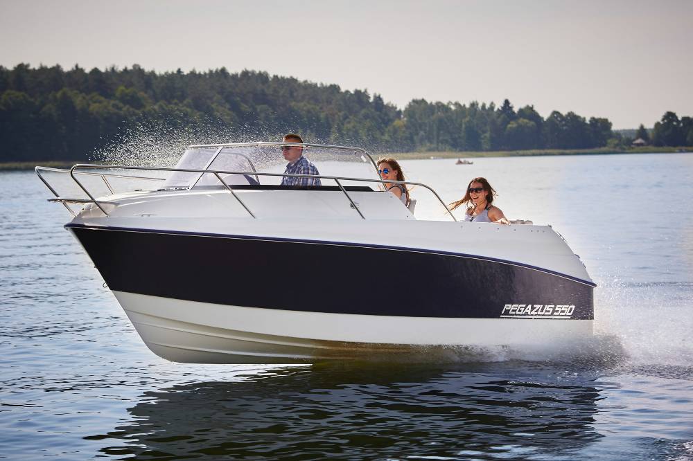 Eine moderne und ergonomische Kajutyacht. Der gut gestaltete Rumpf, die großzügige Breite von 2,54 m und die Bordwandhöhe machen das Boot stabil und sicher, und mit dem passenden Motor erreicht es hohe Geschwindigkeiten. Ein plötzlicher Wetterumschwung auf der Pegazus 550 bedeutet nicht das Ende des Vergnügens, da das Stoffdach in wenigen Minuten aufgebaut werden kann und selbst einer großen Person bequemes Stehen ermöglicht. Das ausklappbare Cockpitbett ist ein perfekter Ort zum Sonnenbaden und bietet zudem zusätzlichen Schlafplatz, insgesamt für vier Personen an Bord. Für längere Fahrten bietet die Werft sanitäre Einrichtungen (Toilette und Dusche), einen Kühlschrank und einen ausklappbaren Kocher an. Die Yacht ist zudem leicht zu transportieren und somit eine ausgezeichnete Lösung für Bootsfahrer, die Abenteuer auf verschiedenen europäischen Gewässern suchen.
