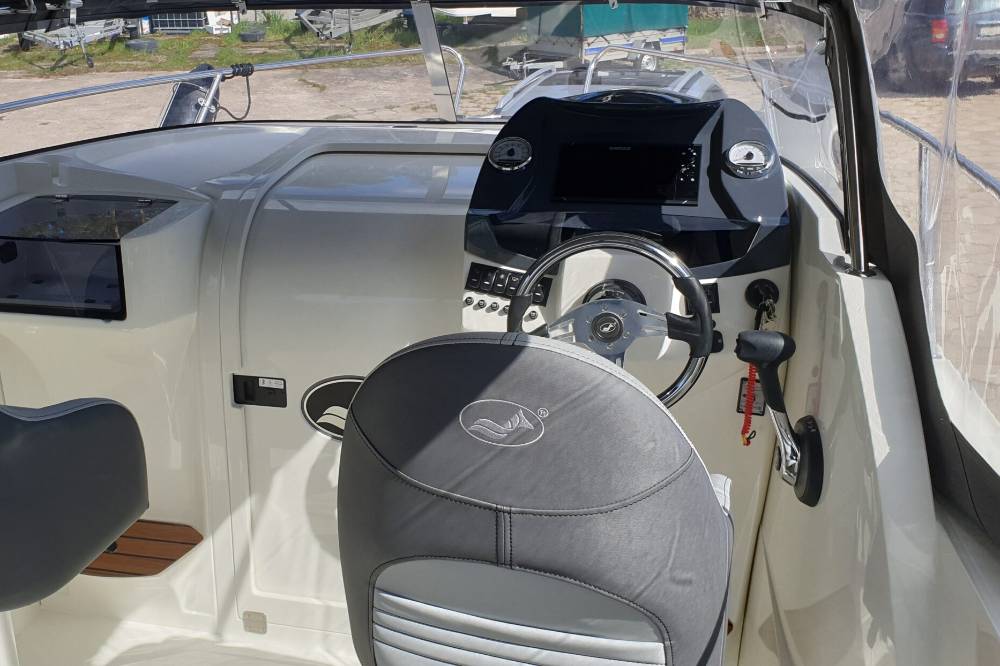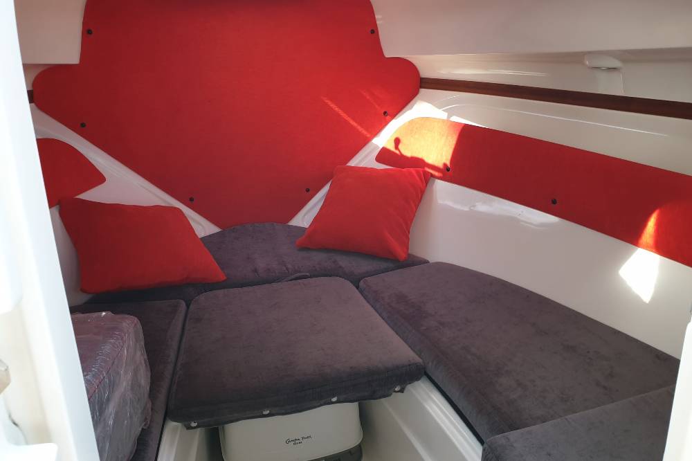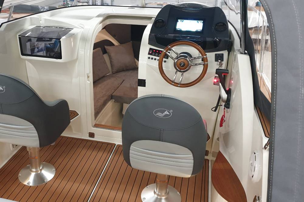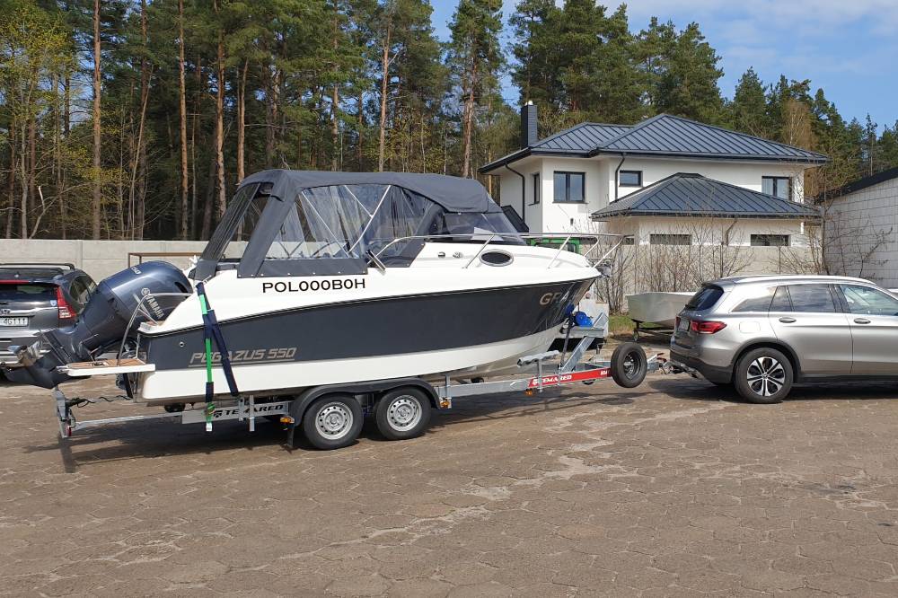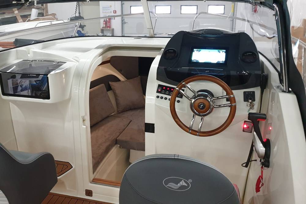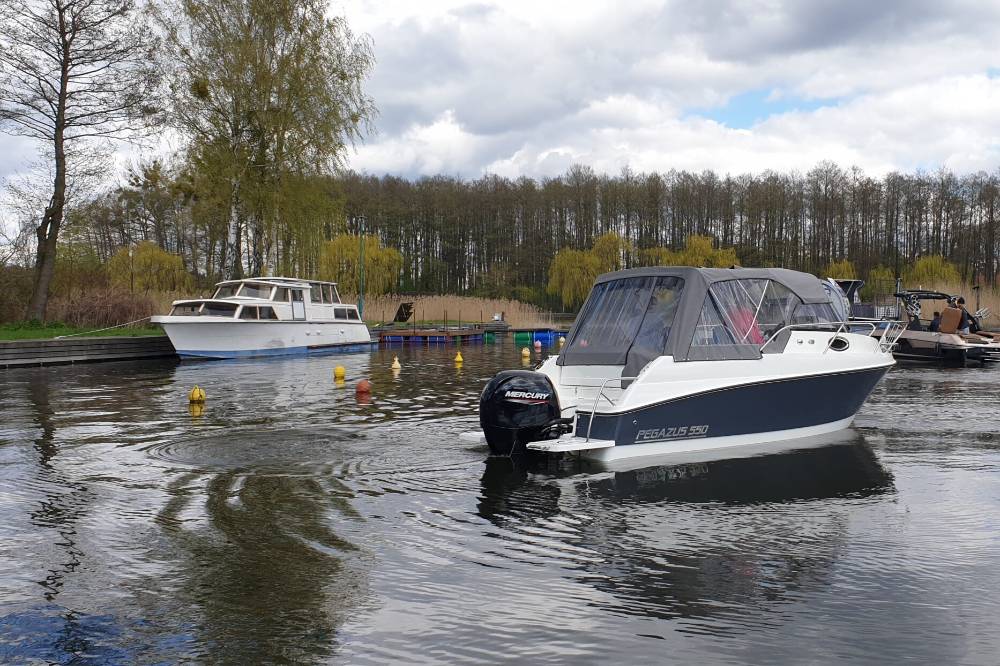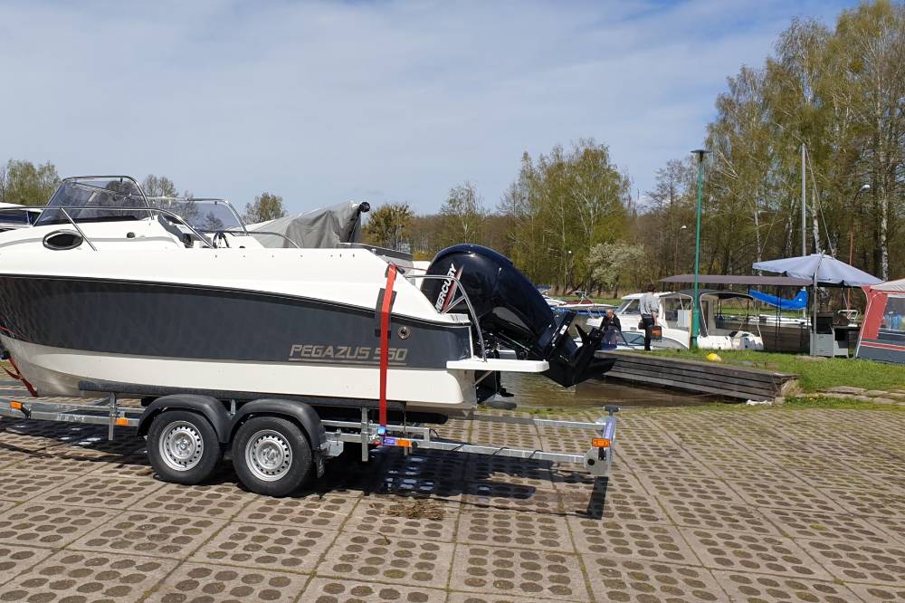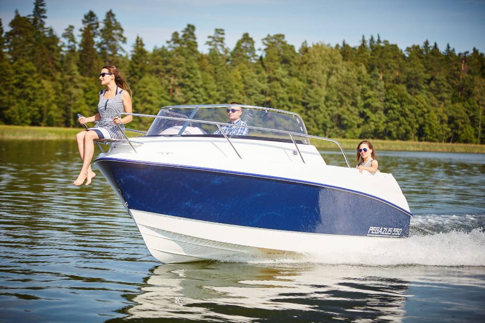 Eine moderne und ergonomische Kajutyacht. Der gut gestaltete Rumpf, die großzügige Breite von 2,54 m und die Bordwandhöhe machen das Boot stabil und sicher, und mit dem passenden Motor erreicht es hohe Geschwindigkeiten. Ein plötzlicher Wetterumschwung auf der Pegazus 550 bedeutet nicht das Ende des Vergnügens, da das Stoffdach in wenigen Minuten aufgebaut werden kann und selbst einer großen Person bequemes Stehen ermöglicht. Das ausklappbare Cockpitbett ist ein perfekter Ort zum Sonnenbaden und bietet zudem zusätzlichen Schlafplatz, insgesamt für vier Personen an Bord. Für längere Fahrten bietet die Werft sanitäre Einrichtungen (Toilette und Dusche), einen Kühlschrank und einen ausklappbaren Kocher an. Die Yacht ist zudem leicht zu transportieren und somit eine ausgezeichnete Lösung für Bootsfahrer, die Abenteuer auf verschiedenen europäischen Gewässern suchen.